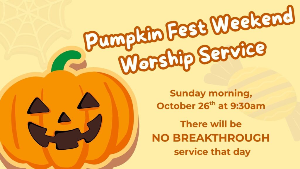 Please note that there will be no Breakthrough Worship Service on Sunday, October 26. Enjoy the parade and Pumpkin Fest Activities.