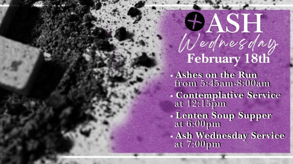 Ash Wednesday, February 18th. Join us for Ashes on the Run at 5:45am, our Contemplative Service at 12:15pm, our Lenten Soup Supper at 6pm and our Ash Wednesday Service at 7pm.
