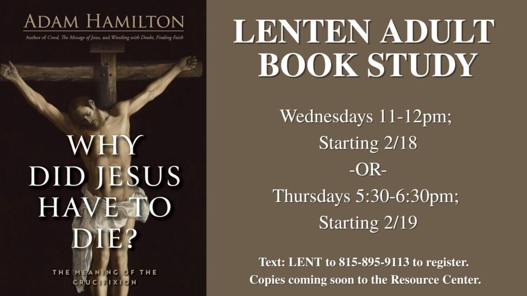 Lenten Adult Book Study – Why Did Jesus Have to Die? A study by Adam Hamilton. Starting Wednesday Feb. 18th from 11am-12pm or Thursday Feb. 19th from 5:30-6:30pm. Register here to reserve your spot. or text LENT to 815-895-9113.
