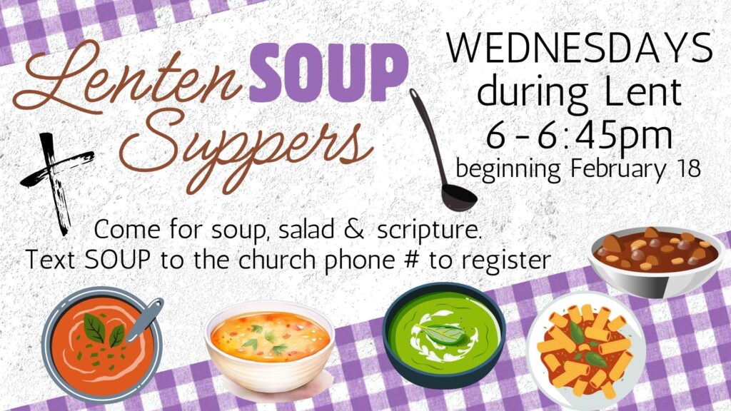 Lenten Soup Suppers, Wednesday’s during Lent from 6pm to 6:45pm. Starts February 18th. Text SOUP to 815-895-9115 to register or follow this link.