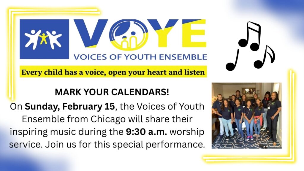 February 15th the Voices of Youth Ensemble will return to share their inspiring music during the 9:30 worship service. Join us for this special perfomance.